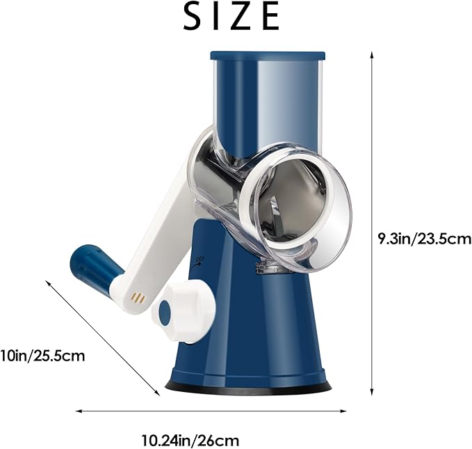 Ourokhome Rotary Cheese Grater Hand Crank, Kitchen Shredder Speed Mandolin Slicer Nut Grinder with Handle and Drum Blades for Cheese, Vegetable, Walnut, Chocolate, Potato, Carrot, 3 Blades, Dark Blue