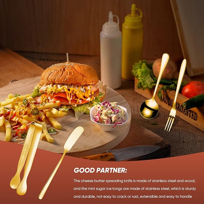 - Ample quantity: includes 4 pieces cheese butter spreader knives with stainless steel handles, 2 pieces mini serving tongs, 4 small spoons and 4 small forks for serving, applied in butter, cheese, butter, jelly, butter and pastry making; It is enough to satisfy your daily needs and can be given to relatives and friends as gifts, which can bring a lot of convenience