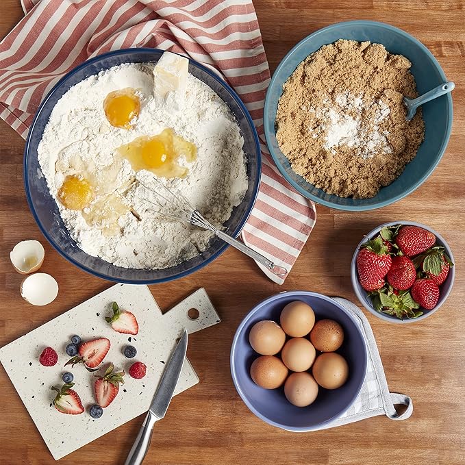 • VINTAGE STYLE: Our embossed Hobnail mixing bowls bring a vintage style to your kitchen, with a simple textured pattern that gives each bowl a casually elegant look and a comfortable grip for mixing together ingredients. The charming palette of pastel blues adds a lovely touch of color to your kitchen design. Vintage style meets modern convenience, as these practical mixing bowls nest for space efficient storage in the kitchen.