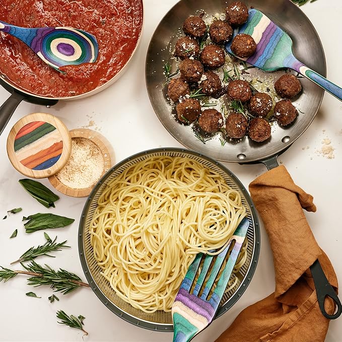 • CRAFTED WITH COLOR: These gorgeous utensils feature an eye-catching blend of electric blue, vibrant green, royal purple and natural birch wood colors