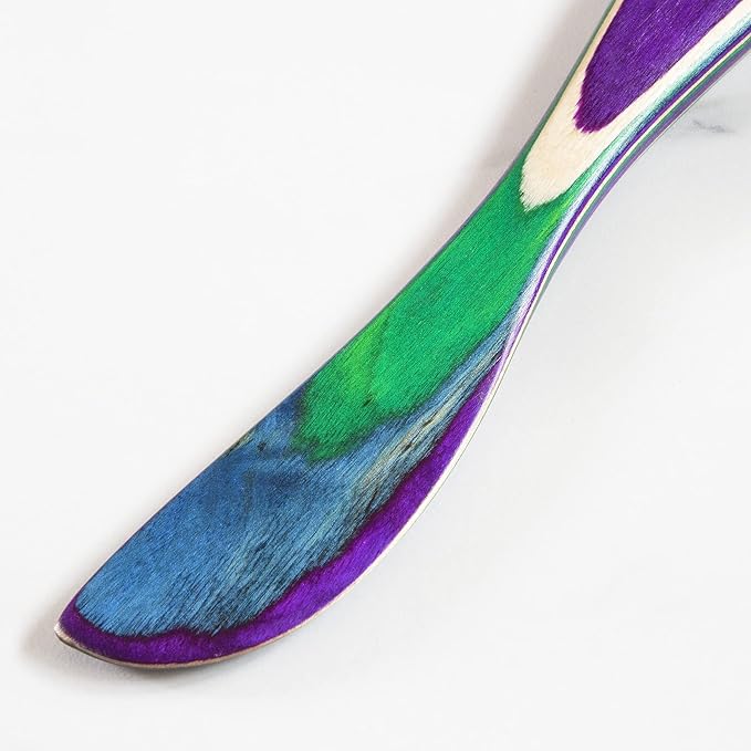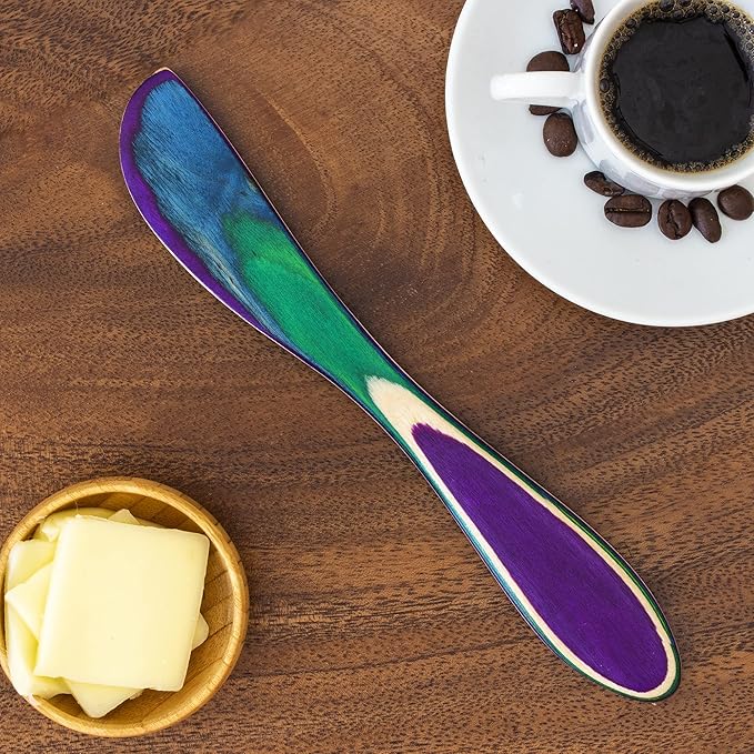 • CRAFTED WITH COLOR: This gorgeous spreading knife features an eye-catching blend of electric blue, vibrant green, royal purple and natural birch wood colors