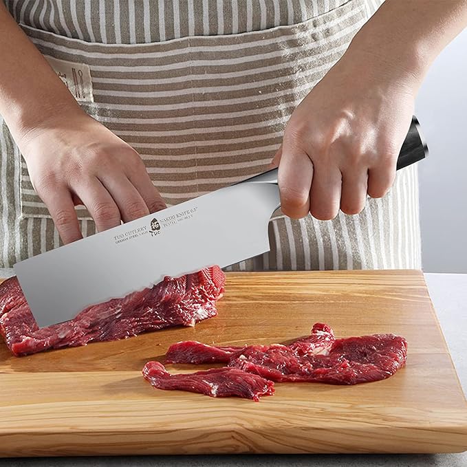 - 👨🍳【PROFESSIONAL NAKIRI KNIFE】: This Japanese 6.5-inch nakiri knife can easily meet your daily kitchen needs. The slender blade design better ensures your safety. The design of the Asian vegetable cleaver allows you to cut straight up and down, such as cutting, slicing, dicing, chopping and filling fish, meat, vegetables and fruits. The Japanese usuba knife is a dazzling presence no matter where it is placed in the kitchen.