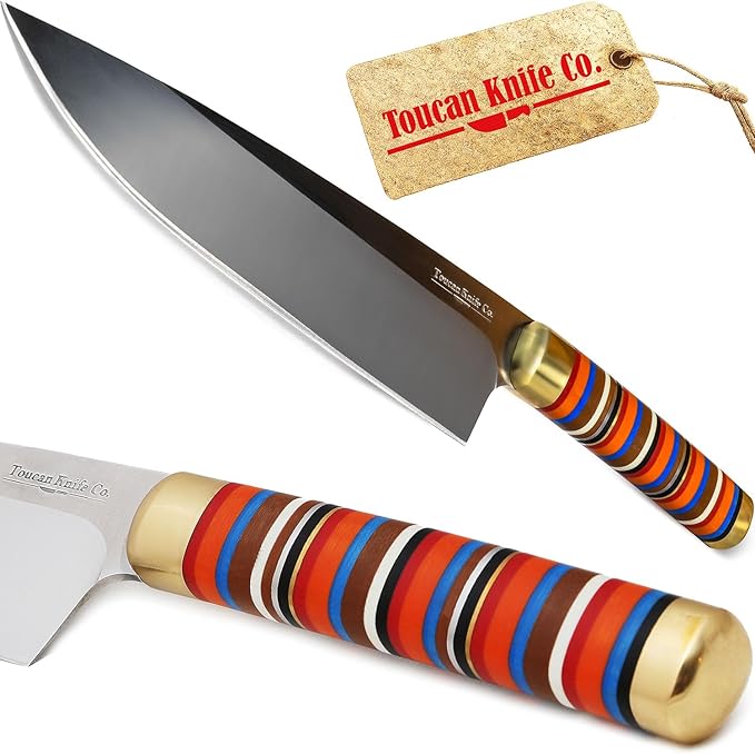 • PATENT PENDING - A Must in Your Kitchen: If you are looking for a professional upgrade for your kitchen accessories, the Toucan Chef knife is the way to go! This premium knife is here to make your cooking sessions more enjoyable with its balanced design and sharp 8-inch VG10 Japanese stainless steel blade.