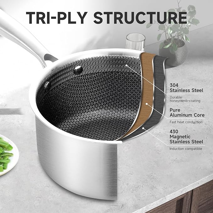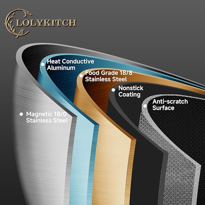 • HEALTHY MATERIAL:These Lolykitch Hybrid Coating Stainless Steel Cookware Set are made up of high-quality ​stainless steel,which is highly durable,corrosion-resistant,and does not react with food to ensure healthy cooking.