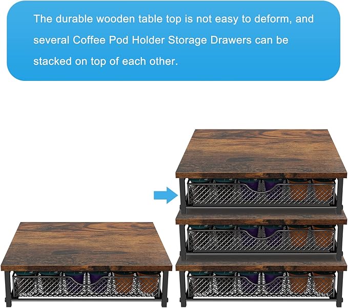 • 【STURDY AND STACKABLE】Sturdy wood worktop and metal frame provide strong support for drawers and coffee maker. You can stack other things on top of the plank, or even stack several coffee pods holder on top of each other.