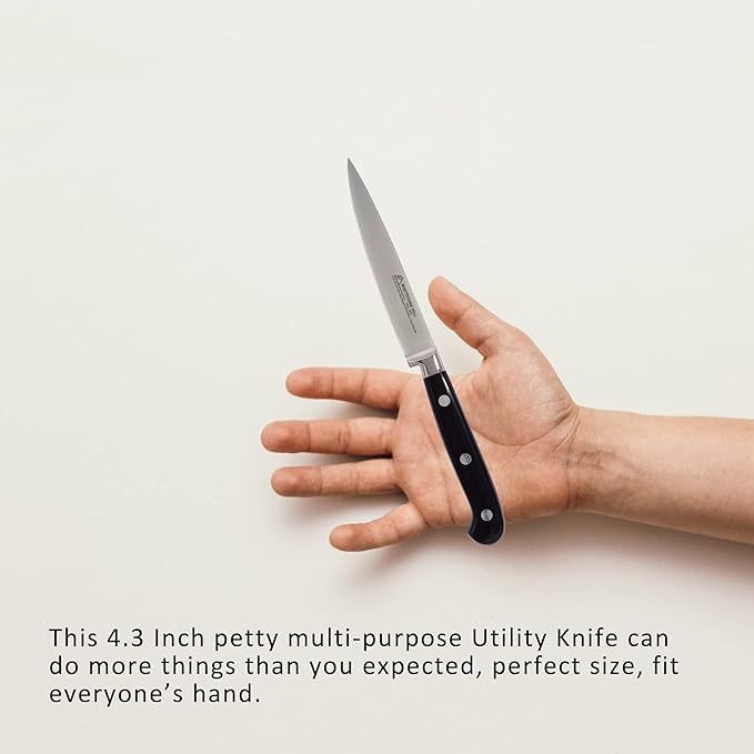 • Kitchen Utility Knife 4.3 Inch: This petty decent kitchen knife is a essential tool for every kitchen. Great for cutting, paring and slicing all kind of vegetable, fruit and meat.