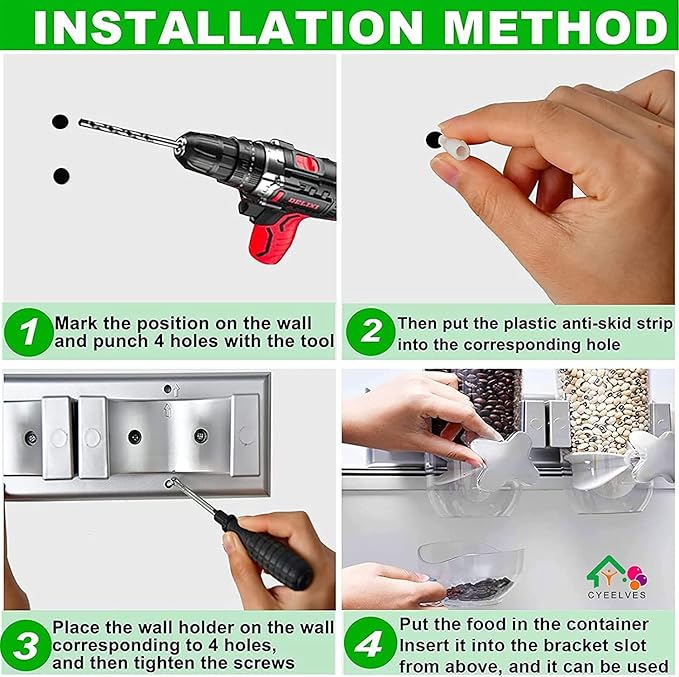 - ❸【Cyeelves Guaranteed & Package Content】--- If the package you received is damaged or missing, or you have any dissatisfaction, Please contact i will replacement to you within 30 days. Premium black, the wall shelf is a classic one-piece style, inseparable. Package: triple controls dry food dispenser, come with 1 wall holder, 3 removable cups, 3 rotary propeller and screw set, easy to install.
