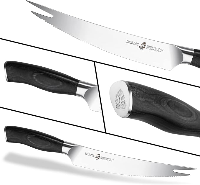 TUO BBQ Knife, 8 inch Roast Cutting Knife with Fork Tip for Grilled Meat Cutting, Serrated Edge, High Carbon German Steel, Comfortable Pakkawood Handle