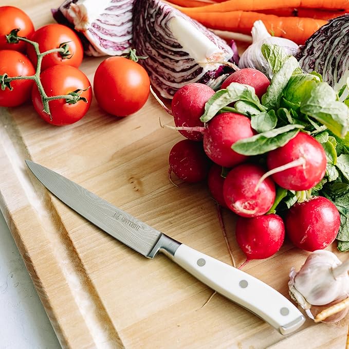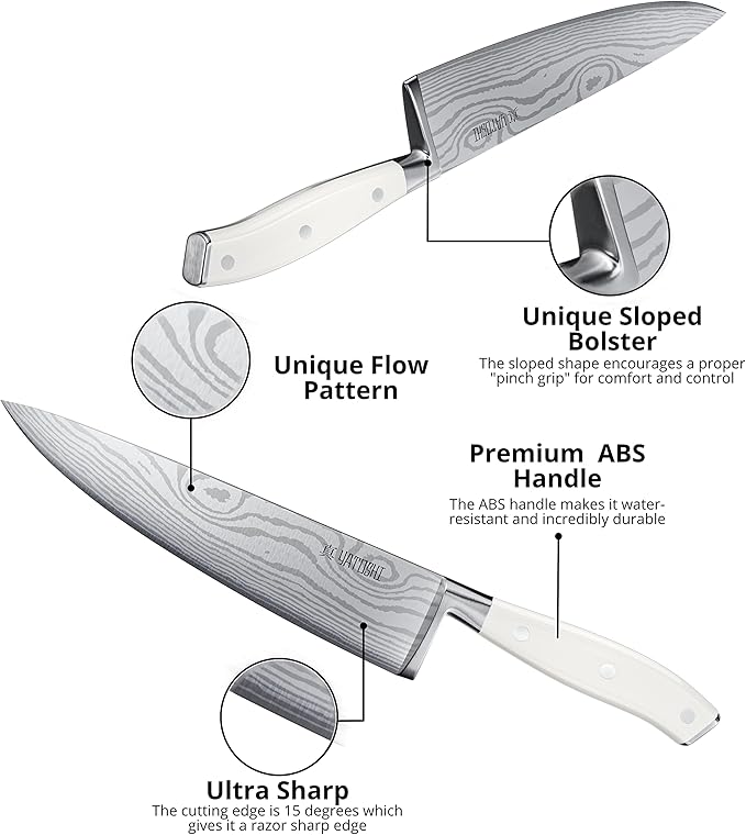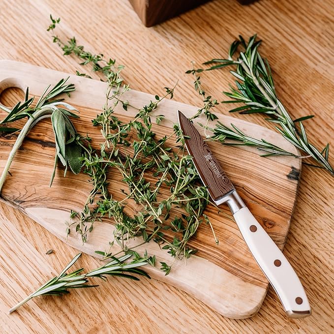 • High-Carbon Blades: Made with premium 7Cr17 High-Carbon Steel, which provides a razor-sharp, professional-quality blade. The steel contains 0.6-0.75 carbon, making it two times tougher than other knives in its class with a Rockwell Hardness of 57-58.