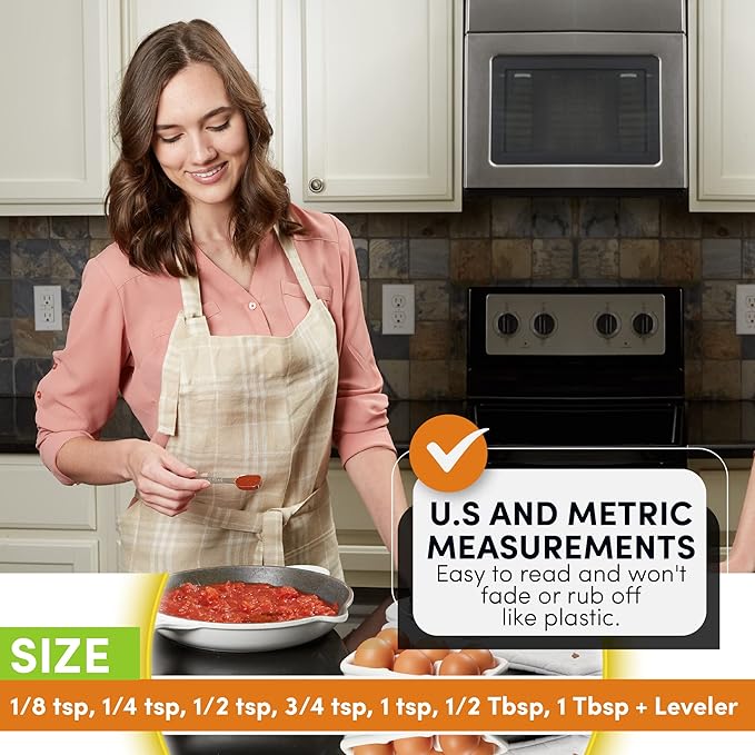 • 7 Convenient Sizes Plus Leveler: 1/8 tsp, 1/4 tsp, 1/2 tsp, 3/4 tsp, 1 tsp, 1/2 Tbsp, 1 Tbsp. The wide, long handle is comfortable to hold and its ergonomic design is easy to fill and level.