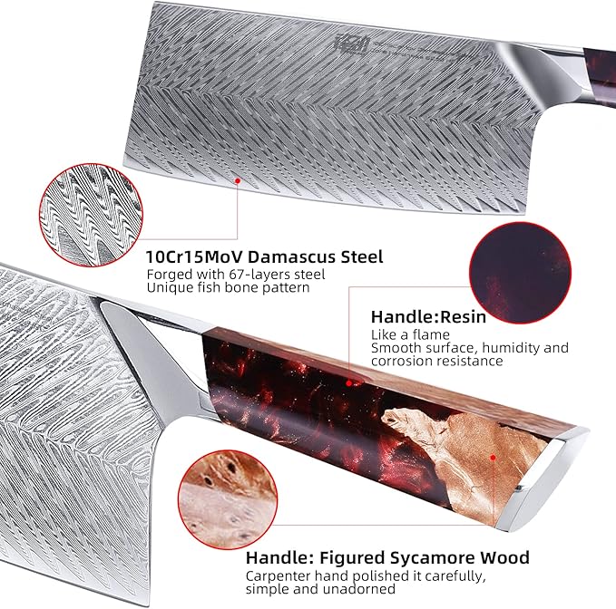 • Material - The blade was constructed of 10Cr15CoMov Damascus steel. Premium metal, sharp and durable, not easy to rust. Handle was made of red Resin and Figured Sycamore wood. A unique design, elegant and exquisite.