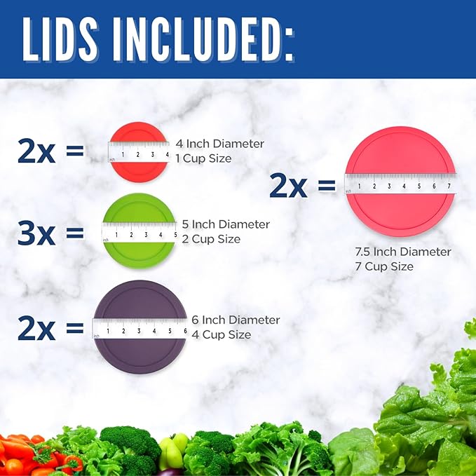 • 9 PC SET: Includes lids for Pyrex (2) 1-Cup 7202-PC, (3) 2-Cup 7200-PC, (2) 4-Cup 7201-PC, (2) 6/ 7-Cup 7402-PC lids