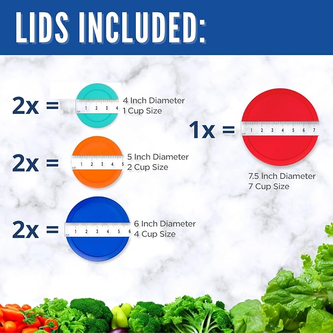 • LID DIMENSIONS: Round Lids 1-Cup 4" / 2-Cup 5" / 4-Cup 6" / 6/ 7-Cup 7.5"