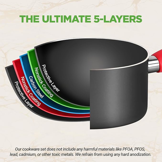 • UNIVERSAL COOKING: These pots and skillet fry pans and utensils set are safe for use in gas, electric & ceramic counter cooktops. Made of pressed aluminum metal with a coating thickness of 20-25um, 2.2mm multi-layered cookware