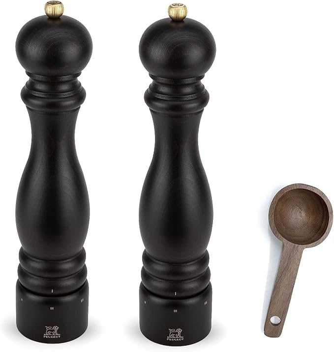 Peugeot Paris u'Select 6 Setting Manual beechwood Salt & Pepper Mill Set With Wooden Spice Scoop Made In France (Chocolate, 12- Inch)