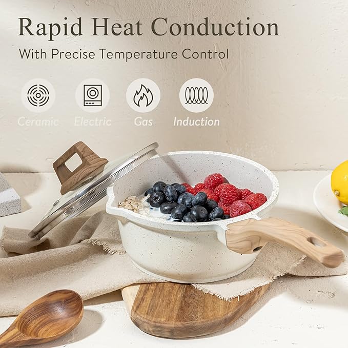 • 【All-Stove Compatible】 - Thanks to the enlarged stainless steel base, this cooking saucepan with lid ensures even heat distribution for consistent cooking results. Designed for ceramic, induction, gas, and electric stoves—one non-stick pot set for all your kitchen needs