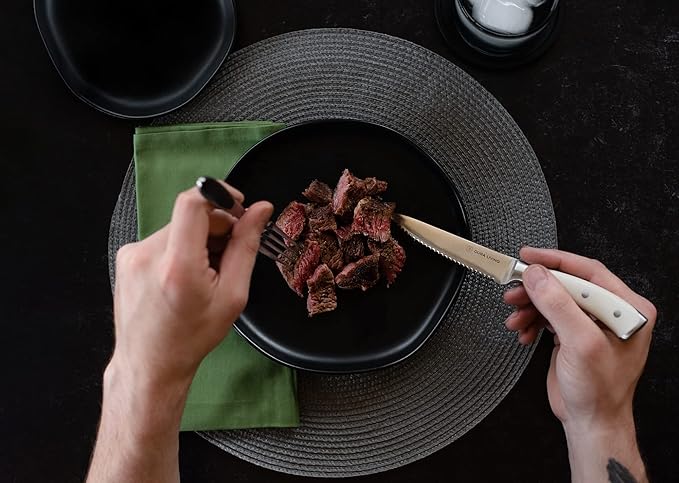 • Durable and Ultra-Sharp Blades: Crafted from high-carbon stainless steel, these serrated steak knives are designed to deliver long-lasting sharpness, effortlessly cutting through meat without tearing. Perfect for steaks, chicken, and more.