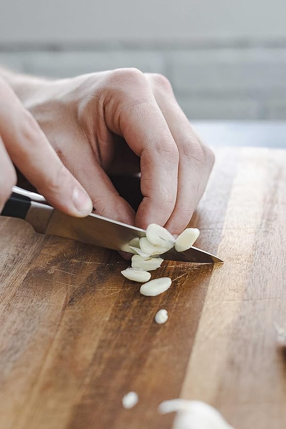 • Precise Paring Knife: This razor-sharp 3.5 inch paring knife is a must-have tool for intricate kitchen tasks. It excels at peeling, trimming, and precise cutting, making it an essential companion for any home cook.