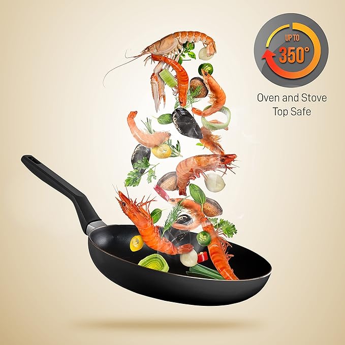 • SEE-THROUGH LIDS: The non stick cookware is equipped w/ see through tempered glass lids w/ vent holes that allow steam to escape. Dishwasher safe cookware set effectively distributes & retains heat for even cooking w/ 350° F max temperature