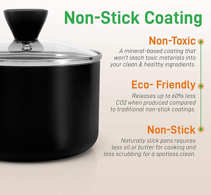 • NON-STICK COATING: The PTFE/PFOA/PFOS-free non stick pot set cooking ware features a long lasting nonstick coating for easy food release or tossing, cleaning & healthy cooking w/ heat resistant kitchen tool utensils to maximize cooking experience