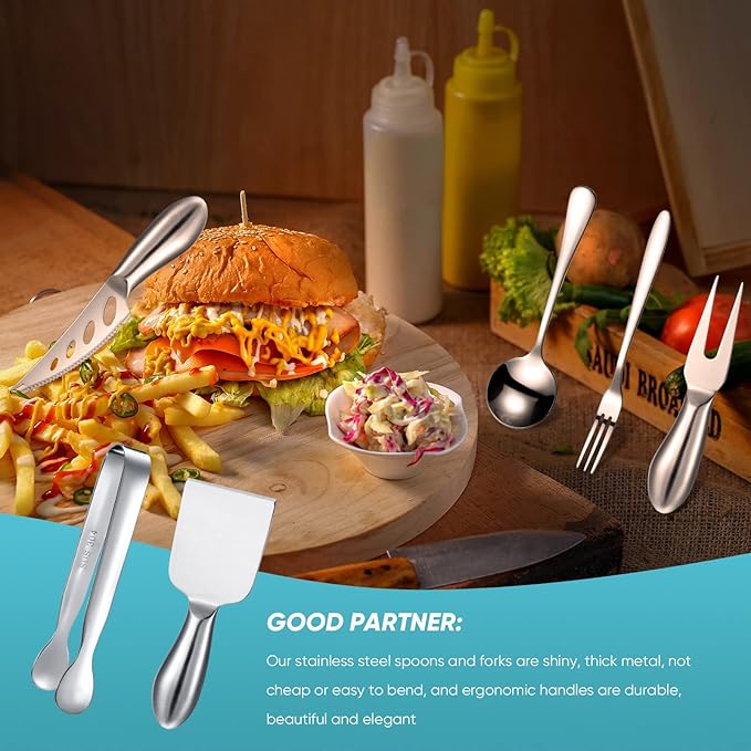 • Wide applications: this spreader knife set is suitable for cheese, butter, or cream, and the spoons, forks, and tongs can be applied for coffee, desserts, yogurt, ice cream, appetizers, sauces, condiments, sugar, and so on, multipurpose kitchen tool for you