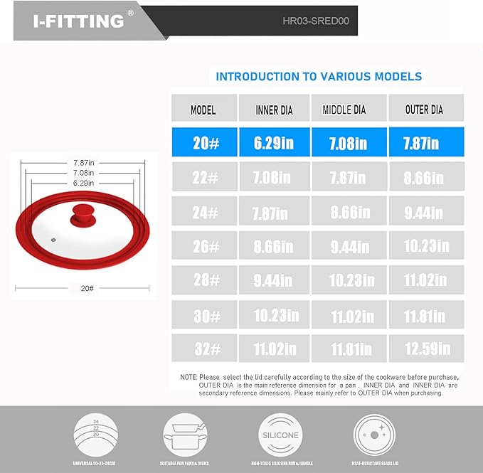 • 【UNIVERSAL LID WITH STEAM VENT】 Universal silicone glass cover lid suitable for pan/pot/skillet/saucepan/frying pan/soup pot , can fit 6.5", 7", 8” (16, 18, 20CM ) cookware. Designed with stainless steel steam vent, effectively prevent overflow during cooking