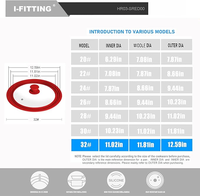• 【UNIVERSAL LID WITH STEAM VENT】 Universal silicone glass cover lid suitable for pan/pot/skillet/saucepan/frying pan/soup pot , can fit 11” ,12” ,12.5” (28,30,32CM ) cookware. Designed with stainless steel steam vent, effectively prevent overflow during cooking