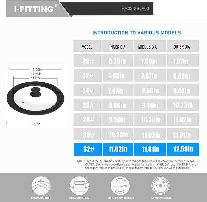 • 【UNIVERSAL LID WITH STEAM VENT】 Universal silicone glass cover lid suitable for pan/pot/skillet/saucepan/frying pan/soup pot , can fit 11” ,12” ,12.5” (28,30,32CM ) cookware. Designed with stainless steel steam vent, effectively prevent overflow during cooking