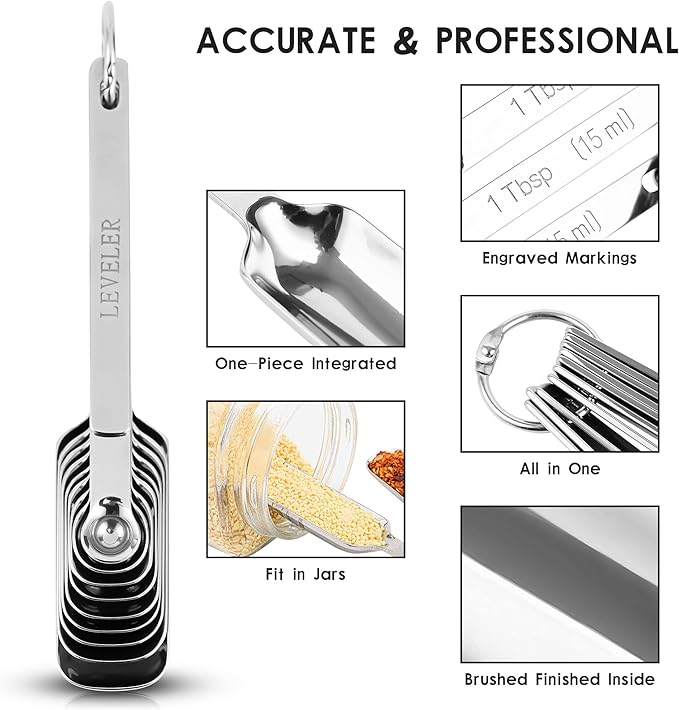 • ✱✱ Stainless Steel Narrow MEASURING SPOONS SET- measuring spoons set of 9 individual different sized Measurement spoons :1/16tsp, 1/8 tsp, 1/4 tsp, 1/2 tsp, 3/4 tsp,1 tsp, 1/2 Tbsp, 2/3 Tbsp,1 Tbsp With accurate tsp/tbsp and ml measurements, so easy accurate measure marking in different spoon sizes.provide accurate measurements for your cooking and baking needs, with bonus a ring and Leveler