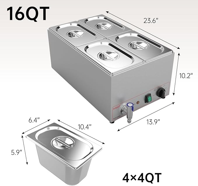 • 16QT Large Capacity: 16 QT commercial food steam table, 4 QT for each compartments. 1/4 GN Dimensions: 10.4" L x 6.4" W x 5.9" H; Our bain marie food warmer is equipped with 4x1/4 GN, allowing you to serve four different dishes simultaneously. Power: 900W 120V.