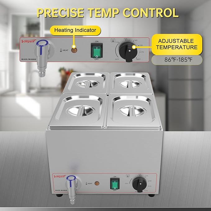 • Commercial Grade Stainless Steel: The 120V electric commercial food warmer is constructed with premium Stainless Steel machine body, practical lid, faucet and upgraded heating tube. Adjustable heat control (86℉-185℉). The U-shaped heating pipe distributes evenly and quickly heat.