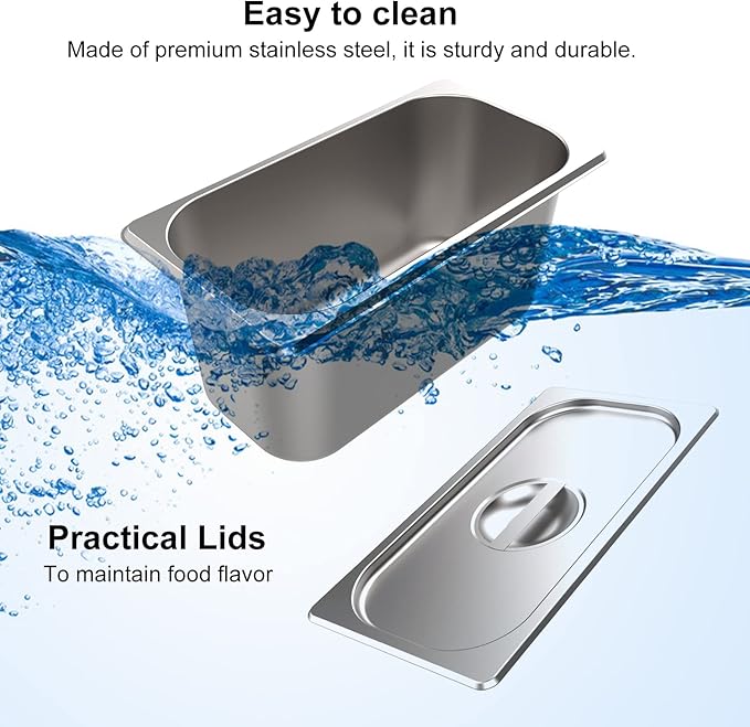 • Easy Operation & Cleaning: Each pan with a practical lid, can keep the pan's contents warm. The commercial food steam tablecomes with a tap which can help pour water out and easy to clean.