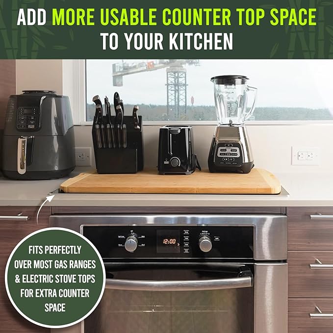 • TRANSFORMS YOUR STOVETOP INTO A CHEF’S WORKSTATION – Instantly reclaim precious counter space by covering your stovetop with this gorgeous slab of bamboo. More room. More freedom. More joy in every meal you prepare.