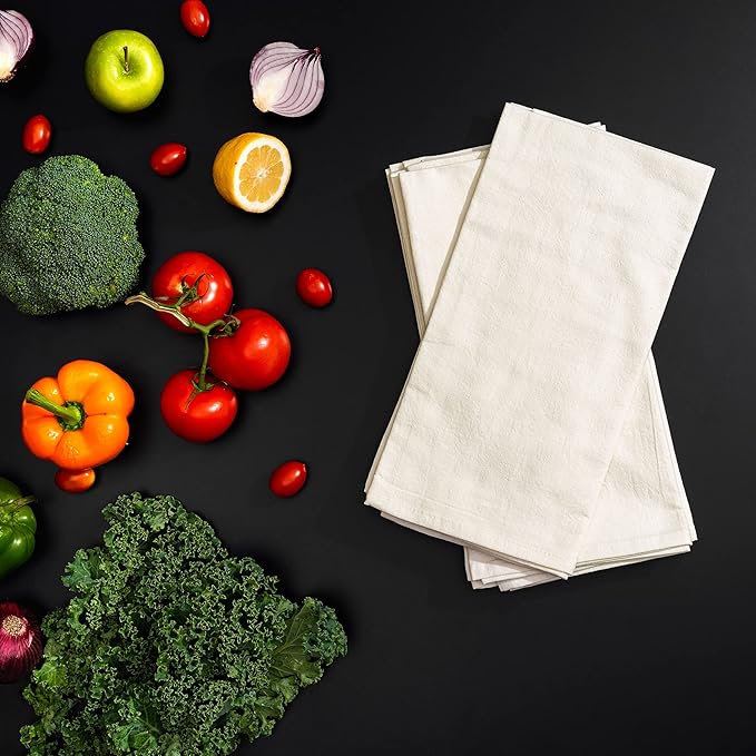 - Unbleached Cotton White Tea Towels - These are natural unbleached flour sack towels and are a perfect addition to your home. These do not contain any harmful chemicals or dyes and are made of 100% unbleached organic cotton giving it the creamish (ivory) look. Once the tea towel for kitchen is dirty, simply wash and it's ready for reuse. These machine-washable and premium quality cotton towels are a great alternative to wasteful paper towels and other disposable products.