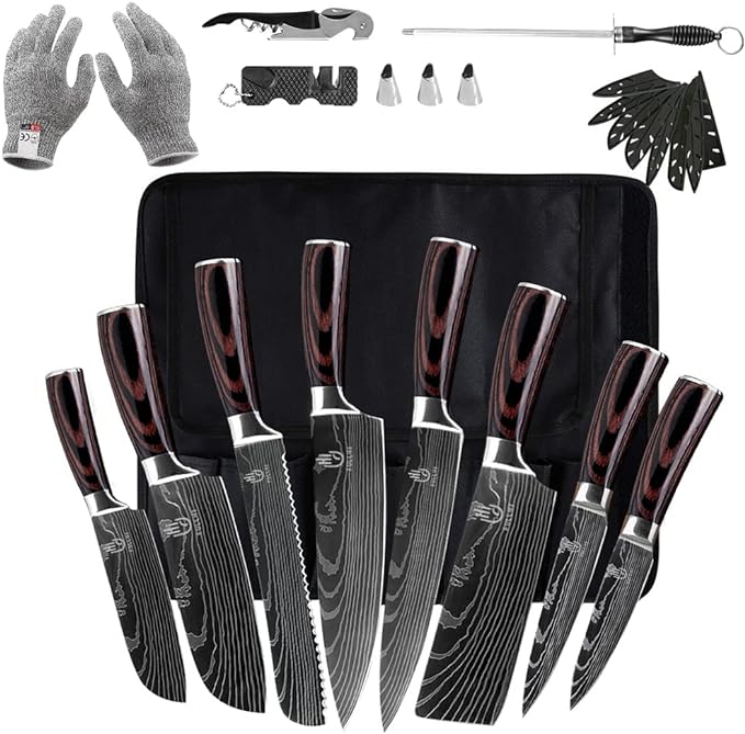 • ALL-INCLUSIVE KNIVES SET: 14-piece kitchen knife set includes 8" Chef Knife, 8" Slicer Knife, 8" Bread Knife, 7" Santoku Knife, 5" Santoku Knife, 7" Cleaver Knife, 5"universal knife, and 3.5" Paring Knife. 3 Stainless Steel Finger Guards, 1 Bottle Opener, 1 Pair of Cut Resistant Gloves, 1 Portable Knife Sharpener, 1 Sharpening Stick are included in our giveaway. Whether cooking at home or outdoors, it can meet your needs.