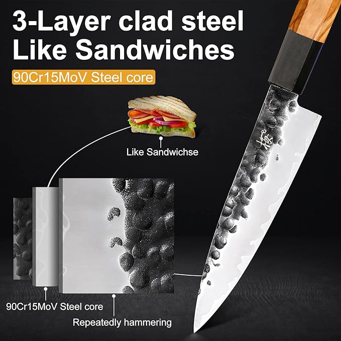 • ✔【Three-layer Composite Steel】Just like a sandwich, the deliciousness is in the middle layer. Our chef's knife, the middle steel core is 90Cr15MoV, and the Rockwell hardness reaches 59± 2 HRC. It only takes one cut to cut beef, which is smooth and easy.