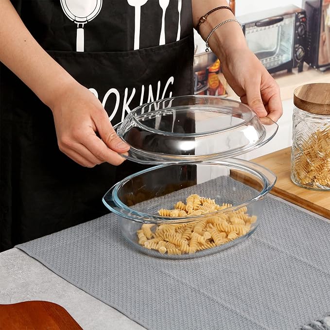 • NICE COOKING DISH: The capacity of the oval covered glass bowls with glass lid is3.5L, Casseroles, bread, or even a rounded lasagna-like dish have all can make in this dish. You’re able to achieve great oven spring without having overdone or scorched bread bottoms like cast-iron tends to do. The casserole dish with glass lid makes a great all-purpose dish for your friends and family who love to cook!