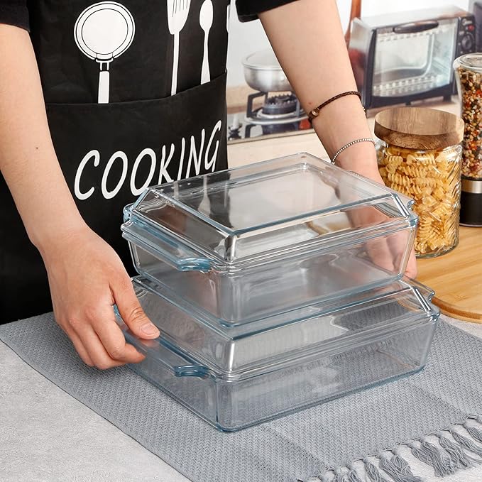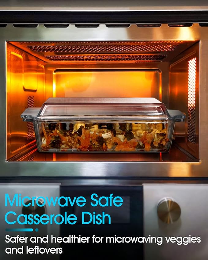 • MADE FROM TEMPERED GLASS: This glass casserole dish can withstand temperatures between 482° F and -40° F without worrying about thermal shock breaking it. Non-porous surface does not absorb food odors, flavors or stains. Clear bowl lets you know how everything is cooking. Takes a lot of the guesswork out.