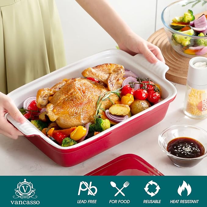 vancasso Blossom Casserole Dish, 13x9 Baking Dish, 3.8 Quart Casserole Dish Set Lasagna Pan Deep With Lid Oven Safe, Red