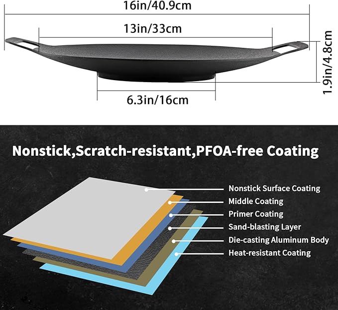 • MATERIAL: Made of solid die-casting aluminum with PFOA-free coating in total 6 layers, it is durable, healthy for cooking and easy to clean (Suggest using soft cloth or sponge)