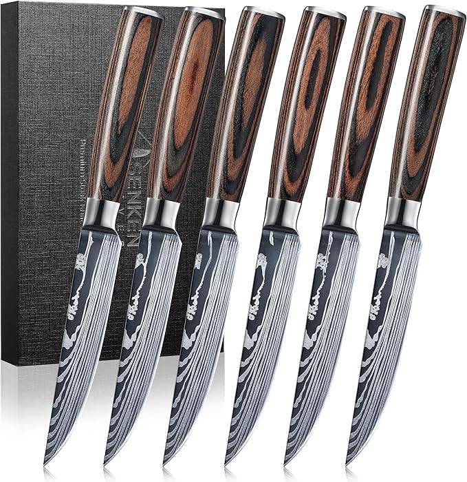 SENKEN Non-Serrated Steak Knife Set with Damascus Pattern - Razor Sharp Straight Edge Blade, Stainless Steel & Wood Handle (Steak Knives Set of 6)