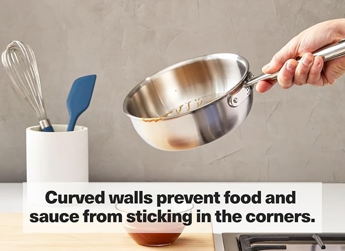 • PREMIUM 5-PLY COOKWARE: Elevate your culinary skills with Misen's 3-Quart Saucier Pan, a versatile addition to your Misen Kitchen. Crafted from 5-Ply Stainless Steel, this Misen sauce pan is compatible with gas, electric, and induction cooktops, and boasts a thick bottom for even heating. The ingenious curved bottom prevents food from getting stuck or burning which happens with more common pots.