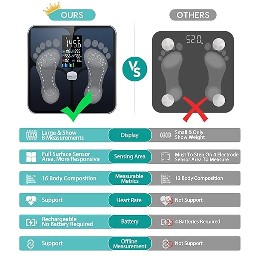 - 1.FSA & HSA Eligible/16 Essential Body Composition Analysis:Weight scale utilizes BIA to measure 16 body data include body weight,heart rate,BMI,muscle rate, body fat,subcutaneous fat,visceral fat,fat-free body weight,body water rate,skeletal muscle rate,muscle mass,bone mass,protein,BMR,heart index,body age.The data stored in the App help to know your body condition comprehensively.