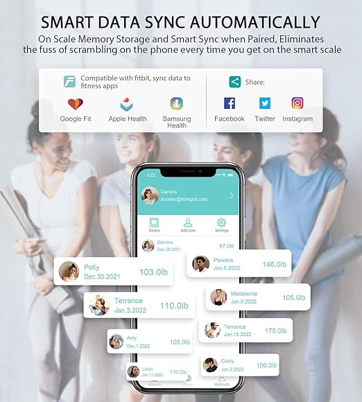 - 4.Syncs with Fitdays APP & Fitness APPs: Download "Fitdays" app on Mobile App Stores.The weight scale syncs the data onto your smartphone automatically via Bluetooth 5.0 BLE. The app provides detailed charts and trends of 16 body composition metrics over days, weeks, months or even years. It can also syncs data to Fitness APPs and share to soical media, which means you can track & manage your health or share your achievements with friends anytime, anywhere.