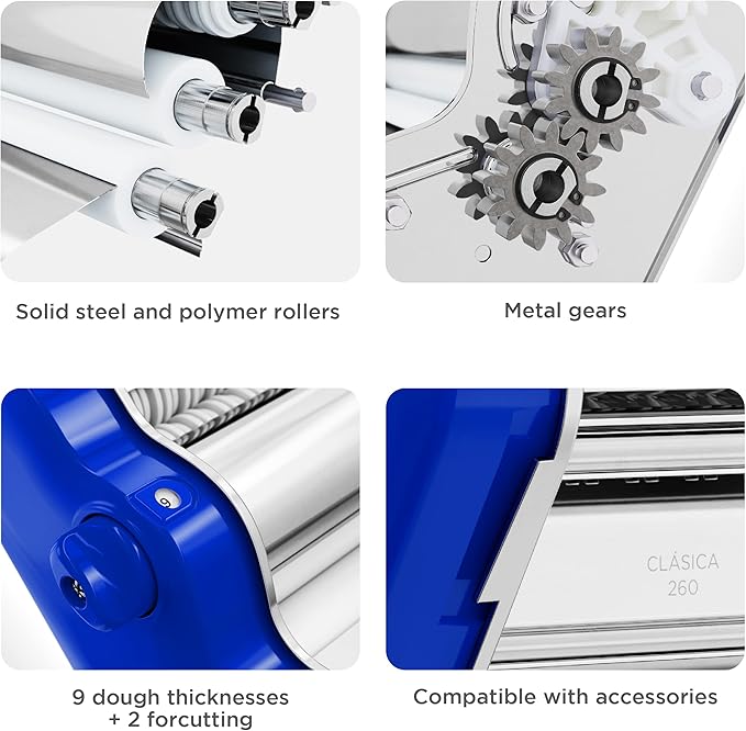 PASTALINDA Classic 260 Pasta Maker Machine, 26 cm Wide Rollers, 9 Thickness Positions, 2 Cutting Positions, Stainless Steel. Includes Reinforced Hand Crank And Two Clamps (Blue)