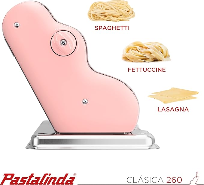 PASTALINDA Classic 260 Pasta Maker Machine, 26 cm Wide Rollers, 9 Thickness Positions, 2 Cutting Positions, Stainless Steel. Includes Reinforced Hand Crank And Two Clamps (Pink)