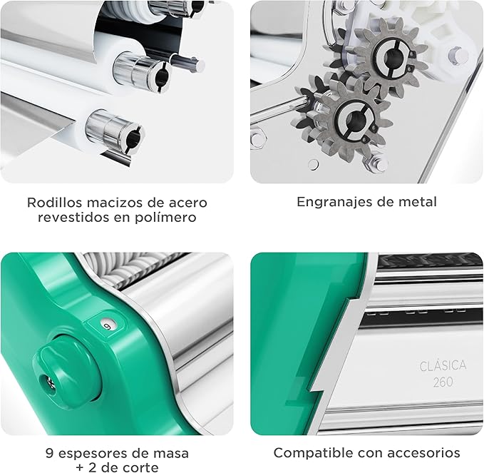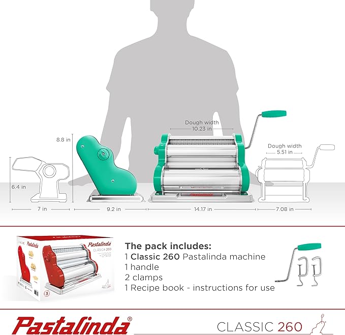 PASTALINDA Classic 260 Pasta Maker Machine, 26 cm Wide Rollers, 9 Thickness Positions, 2 Cutting Positions, Stainless Steel. Includes Reinforced Hand Crank And Two Clamps (Green)