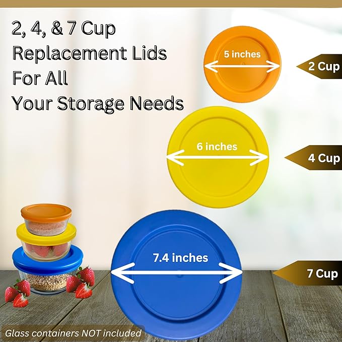 • VALUE PACK BUNDLE INCLUDES - 3 Pack, 1 Each of Size: 2 Cup/470 mL/7200-PC Orange, 4 Cup/950 mL/7201-PC Yellow & 7 Cup/1.65L Blue Round Lids, ⚠️Lids Only⚠️ - 🚫 Glass Containers Not Included 🚫