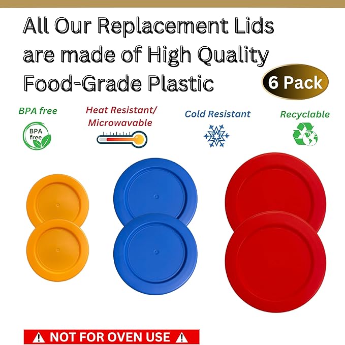 • VALUE PACK BUNDLE INCLUDES - 6 Pack, 2 Each of Size: 2 Cup/470 mL/7200-PC Orange, 4 Cup/950 mL/7201-PC Blue & 7 Cup/1.65L Red Round Lids, ⚠️Lids Only⚠️ - 🚫 Glass Containers Not Included 🚫