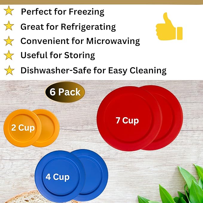 2, 4 & 7 Cup Orange, Blue, Red Replacement Lids/Covers for Pyrex, Anchor Hocking & KlareWare Storage Bowls *Lids Only Glass Container Not Included* (6 Pack *Two of Each Size*)